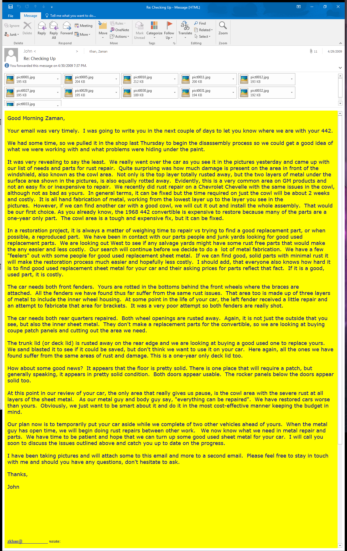 As you already know, the 1968 442 convertible is expensive to restore because many of the parts are a one-year only part. The cowl area is a tough and expensive fix, but it can be fixed.