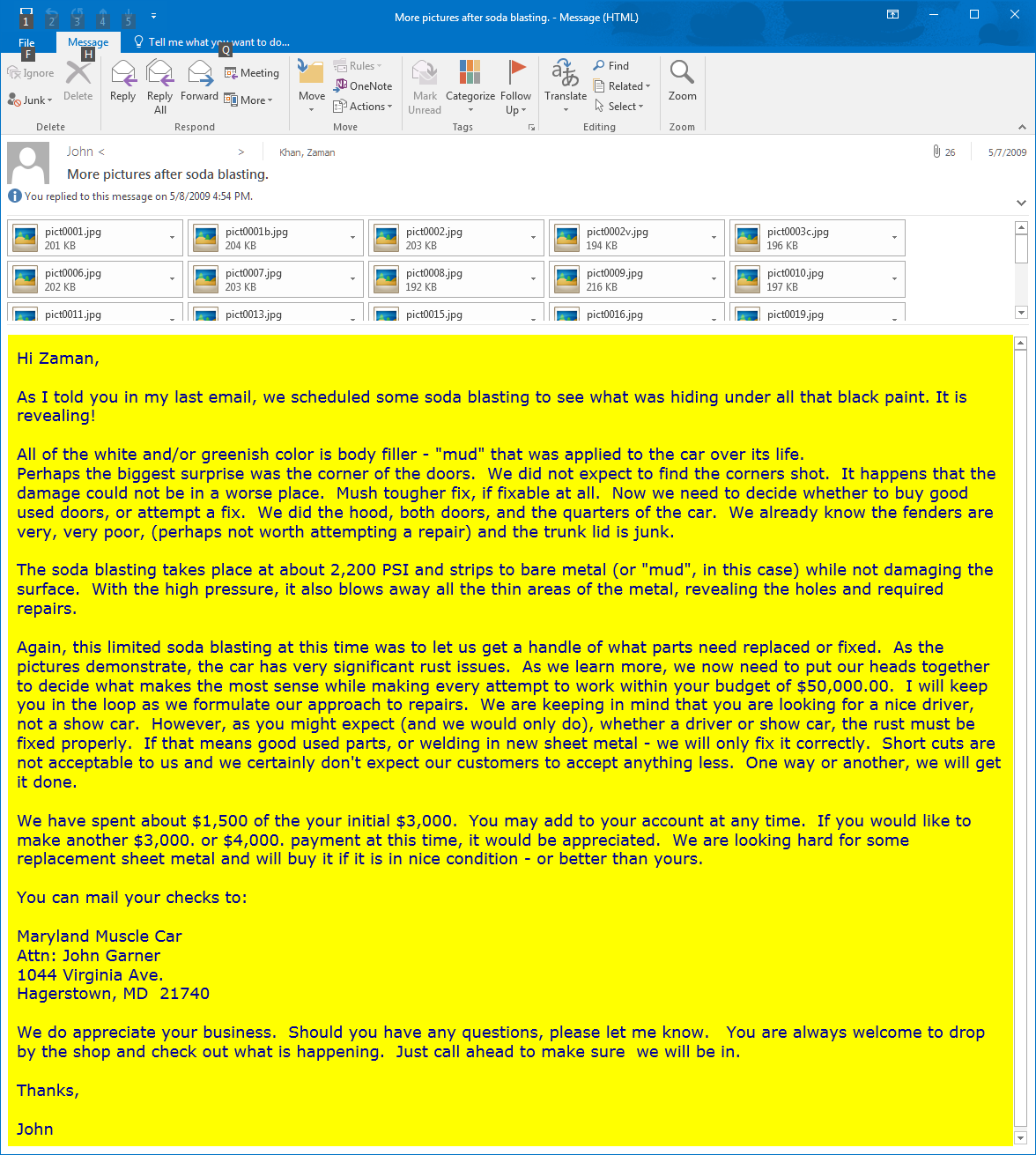 One thing that I did not talk about that is revealed in this email is the project budget. Based on the cursory review of the car when MMC came to my house and our extensive discussion on what I envision the Olds to be once restored, I agreed with them of a budget of around $30K to $50K. This will become just a fraction of what she will end of costing me at the end.